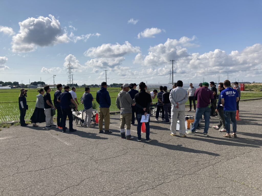 山形県鶴岡市にて、XAGの農業用ドローンを取り扱うビジネスパートナーの担当者や、地元の農家さん約40名を参集し、大型機種P100PROのデモフライトを行いました。